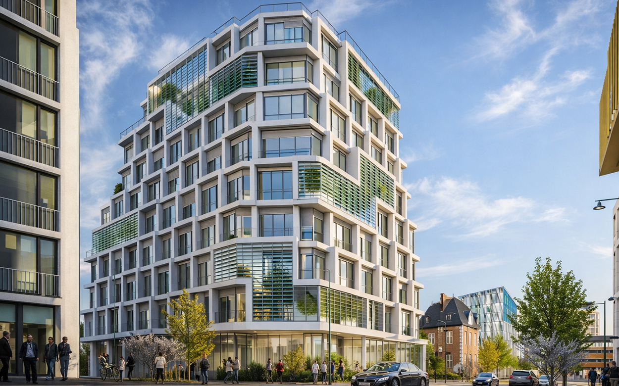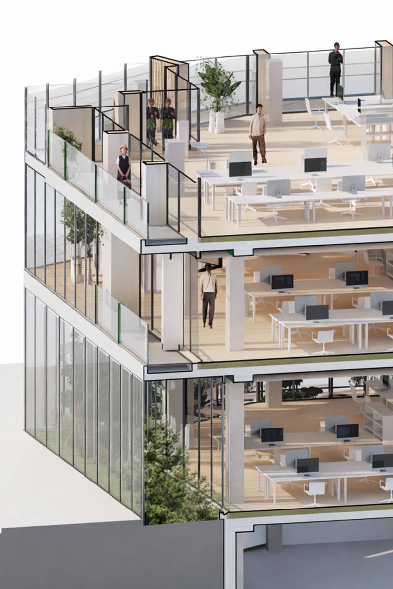 Les façades intérieures en redent et les retraits au Sud et à l'Ouest marquent la continuité avec l’îlot Féval. Ce principe libère les vues et optimise les apports de lumière naturelle. Ce principe de façade s’adapte à chaque niveau en fonction des besoins, le jeu de composition volumétrique permet d’aménager des terrasses protégées, des salles de réunion, des lieux de convivialité. Ces éléments donnent une identité spécifique à chaque étage et selon chaque orientation.