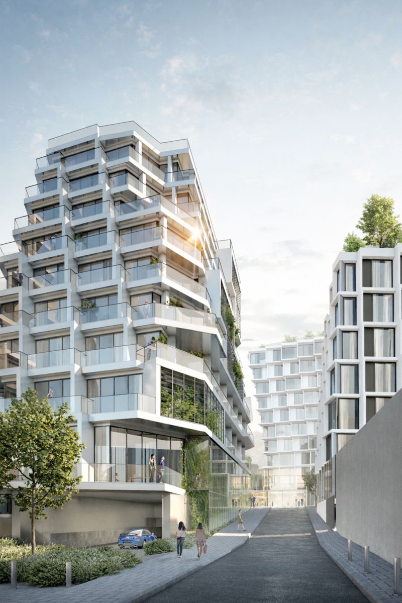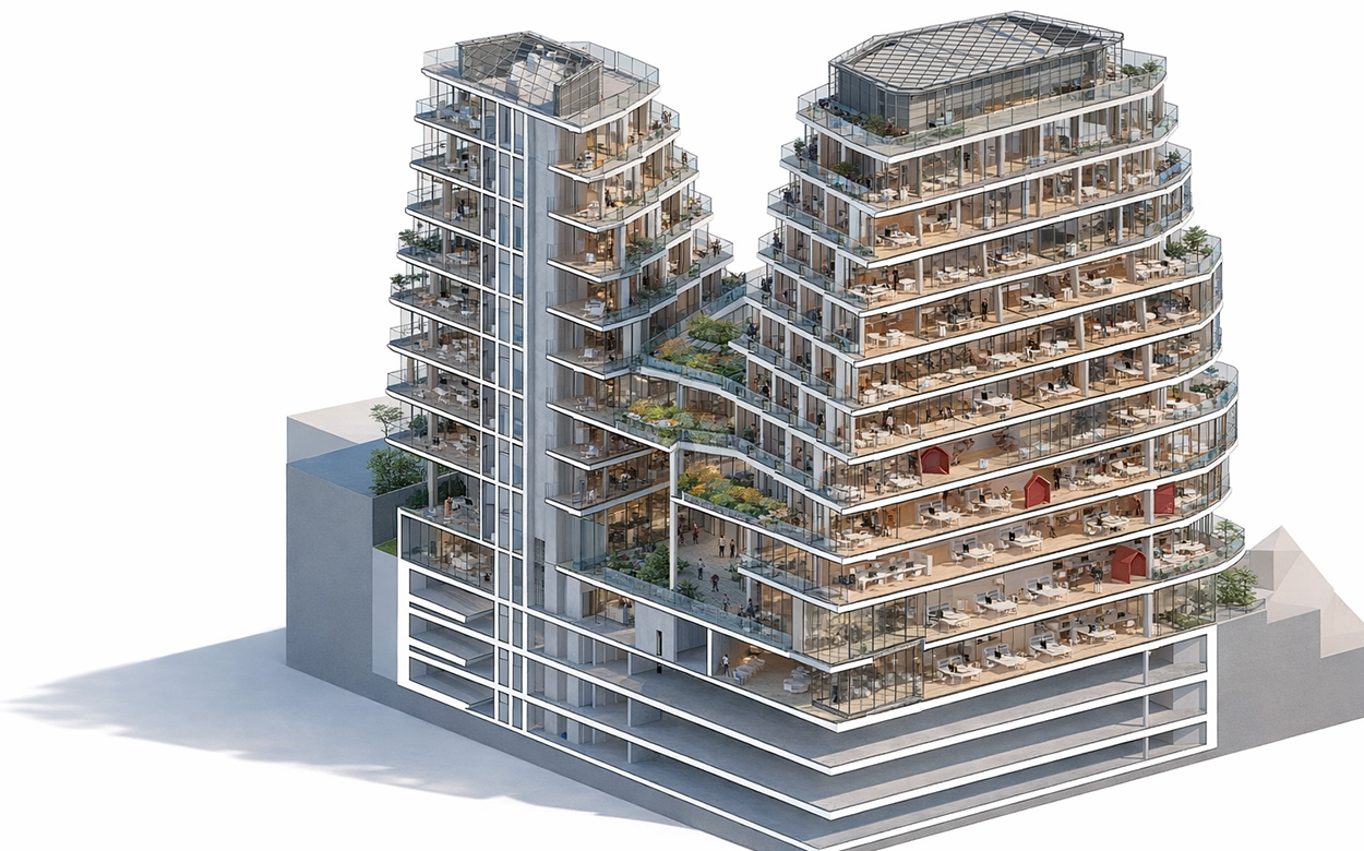 La construction s’organise selon deux immeubles de 8 et 9 étages articulés autour d’un atrium commun.