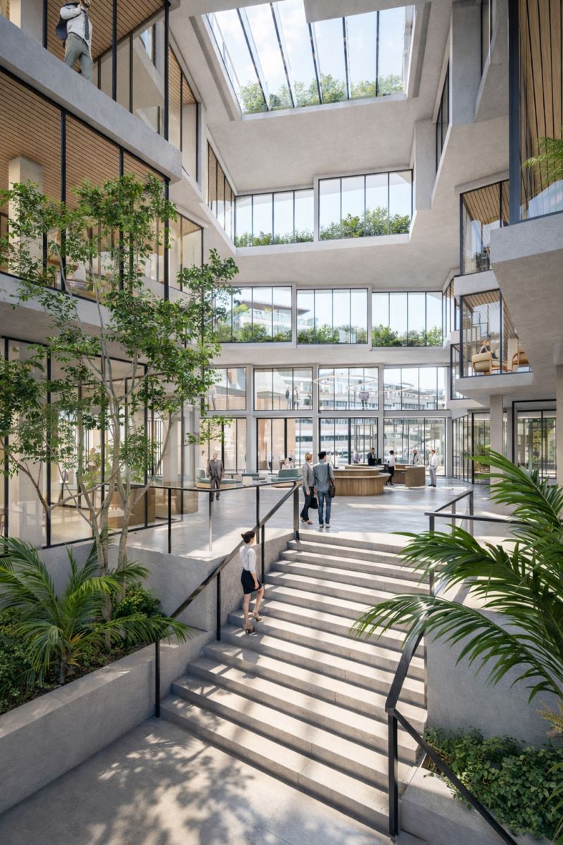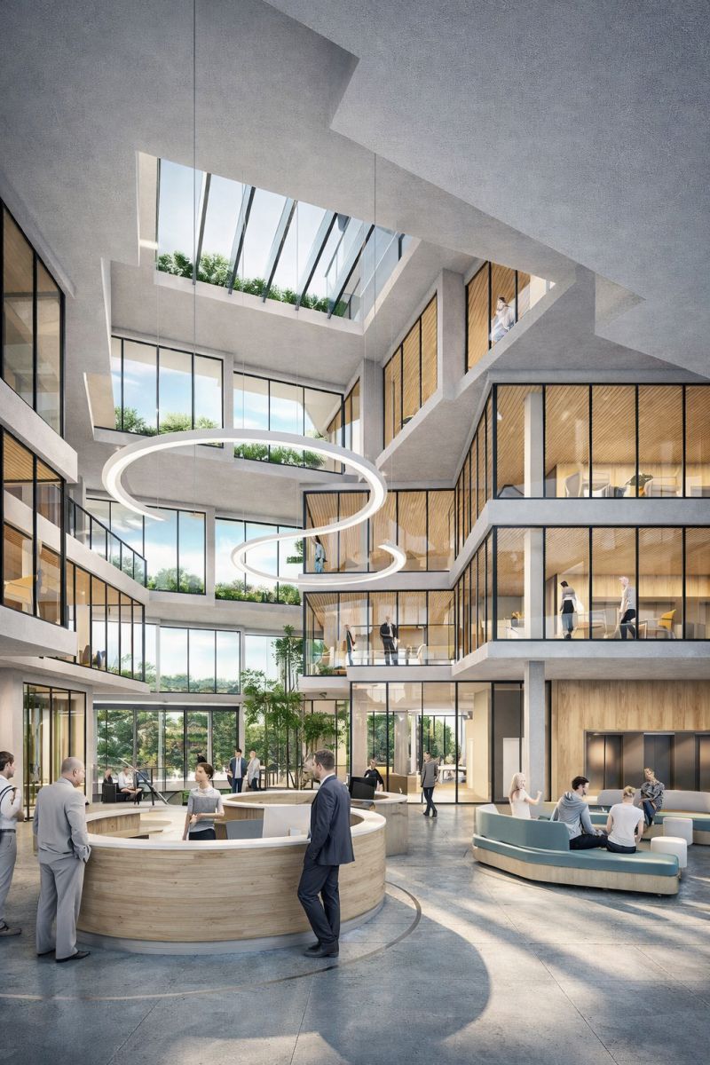 Au cœur du bâtiment, un grand atrium traversant et central relie les deux immeubles. C’est à la fois le lieu d’accueil des visiteurs et de rencontres des employés.