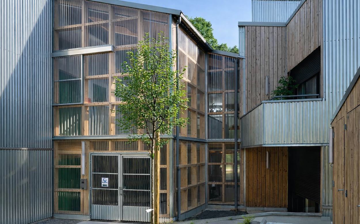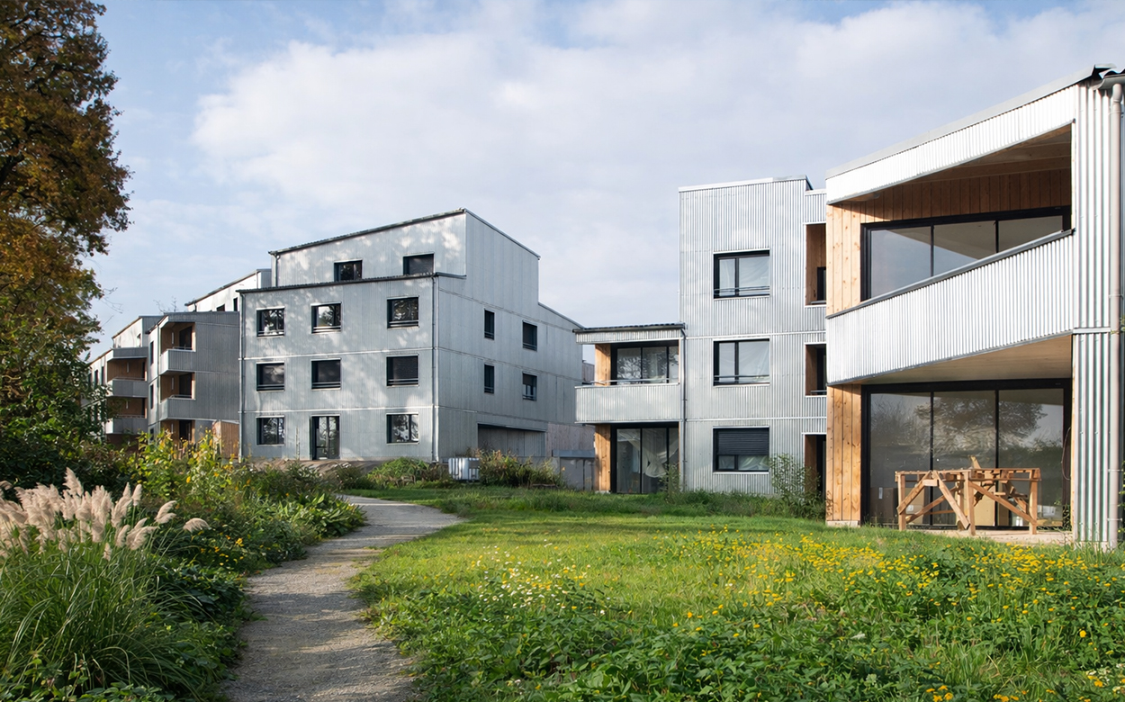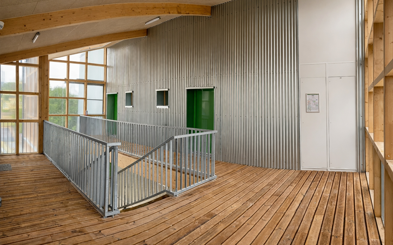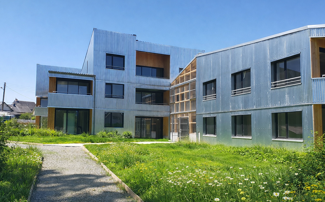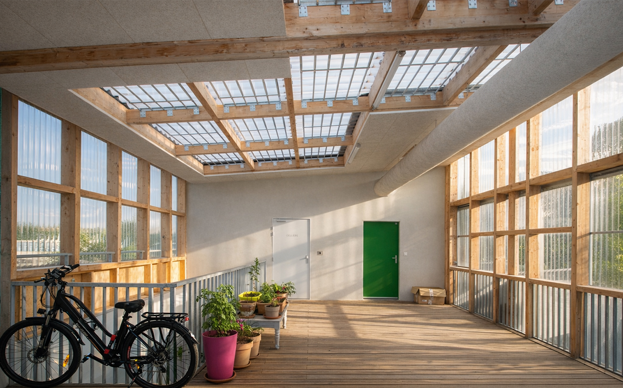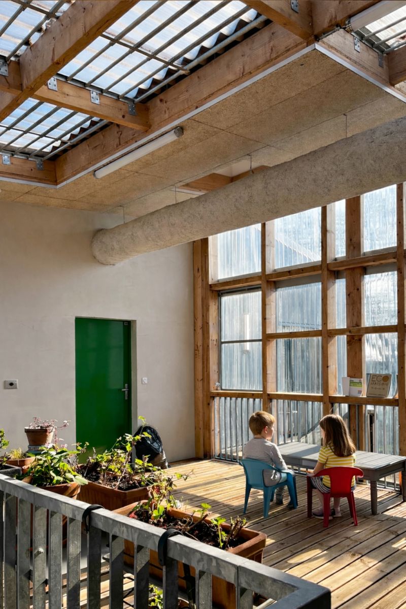 Les logements, conçus lors d’ateliers participatifs, bénéficient tous d’une double orientation et d’espaces extérieurs privés, jardinet, balcon ou loggias. La structure est mixte bois béton, avec un mur d’enveloppe en MOB remplissage ouate de cellulose. Les façades et planchers des «serres» sont entièrement en bois et offrent une qualité d’atmosphère à ces grands paliers appropriables.