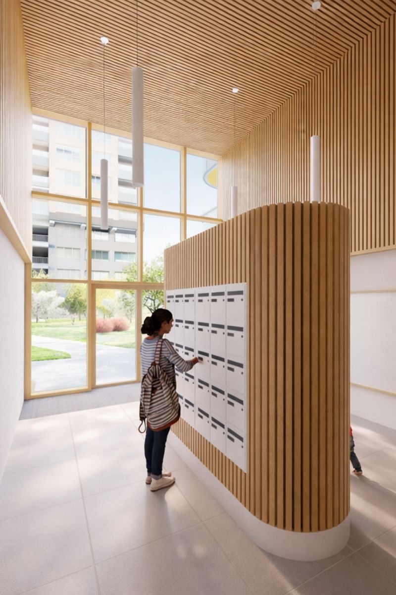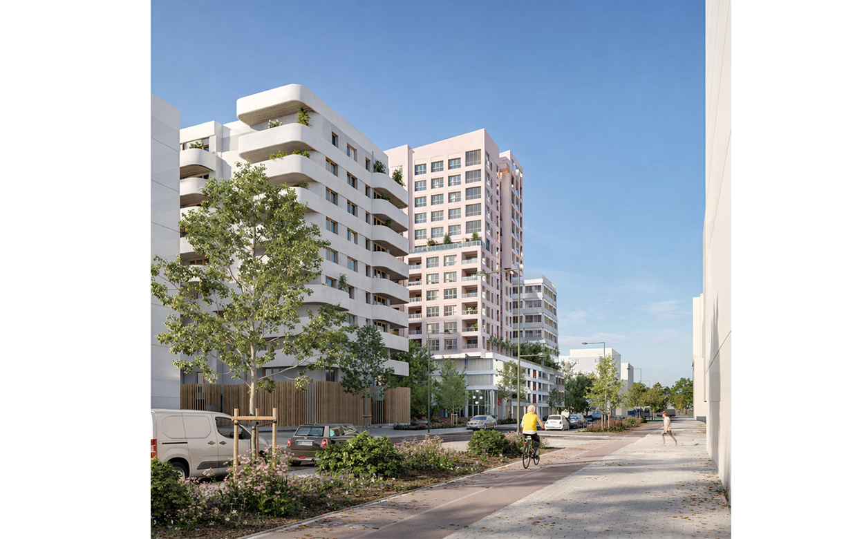 On retrouve un immeuble de logements locatifs social au nord et un bâtiment accueillant de l’artisanat au sud. Sur le bâtiment de logement locatif social, des balcons aux angles arrondis animent la façade tout en offrant des espaces extérieurs généreux aux habitants. Tous les logements ont un balcon devant leur séjour.